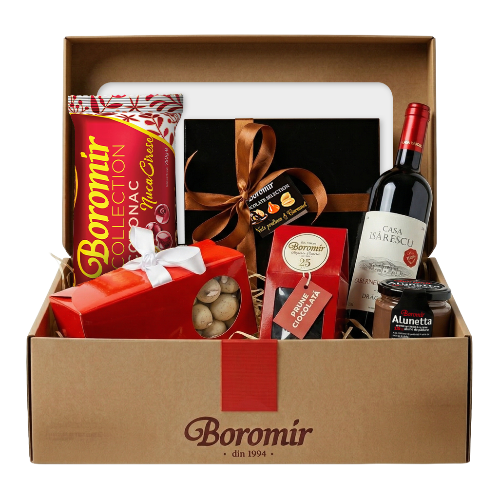 Cadoul Ajun de Crăciun desăvârșește sărbătorile de iarnă cu savoarea bunătăților Boromir și le oferă celor dragi amintiri de neuitat. Pachetul conține crema tartinabilă Alunetta, prune în ciocolată fină, pufosul Cozonac Collection cu nucă și cireșe, migdale în ciocolată albă, praline de ciocolată cu unt de arahide, caramel sărat și Alunetta, completate de o sticlă de vin roșu sec Casa Isărescu Cabernet Sauvignon. Gustul de ciocolată al deliciilor se potrivește perfect cu vinul aromat, desăvârșind masa festivă. Descoperă și alte cadouri dulci cu care să împarți bucurii celor dragi de sărbători.