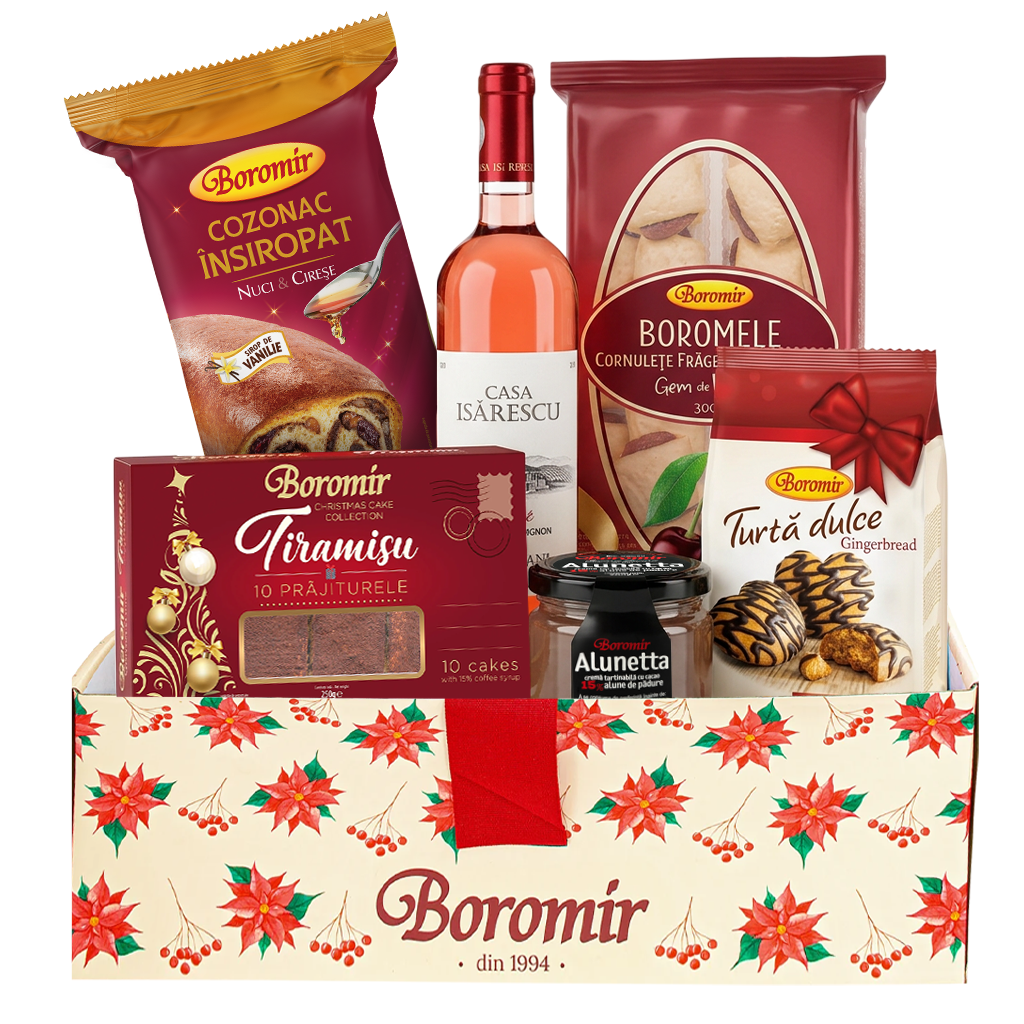 Cadoul Red Velvet a fost special conceput pentru a desăvârși mesele festive cu gusturile bunătăților Boromir. Pachetul conține turtă dulce, cremă Alunetta cu cacao și alune de pădure, cornulețe Boromele cu vin și gem de vișine, prajitură tiramisu, un Cozonac Însiropat cu nuci și cireșe și o sticlă de vin Cabernet Rose. Deliciile dulci cu gust irezistibil sunt completate minunat de buchetul aromat al vinului. Descoperă în Colecția Boromir și alte cadouri rafinate cu care să le oferi celor apropiați momente savuroase de neprețuit.
