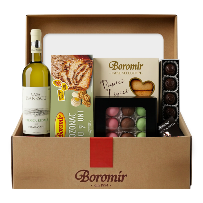 Cadoul Clipe de Savoare a fost special conceput pentru a desăvârși mesele festive cu gusturile bunătăților Boromir. Pachetul conține pișcoturile cu unt și arahide Pupici cu Sclipici, bomboane fondante în diferite culori, praline de ciocolată cu cremă Alunetta, un cozonac cu cremă de ciocolată și rom, și o sticlă de vin feteasca regala Isarescu. Deliciile dulci cu gust irezistibil sunt completate minunat de buchetul aromat al vinului. Descoperă în Colecția Boromir și alte cadouri rafinate cu care să le oferi celor apropiați momente savuroase de neprețuit.