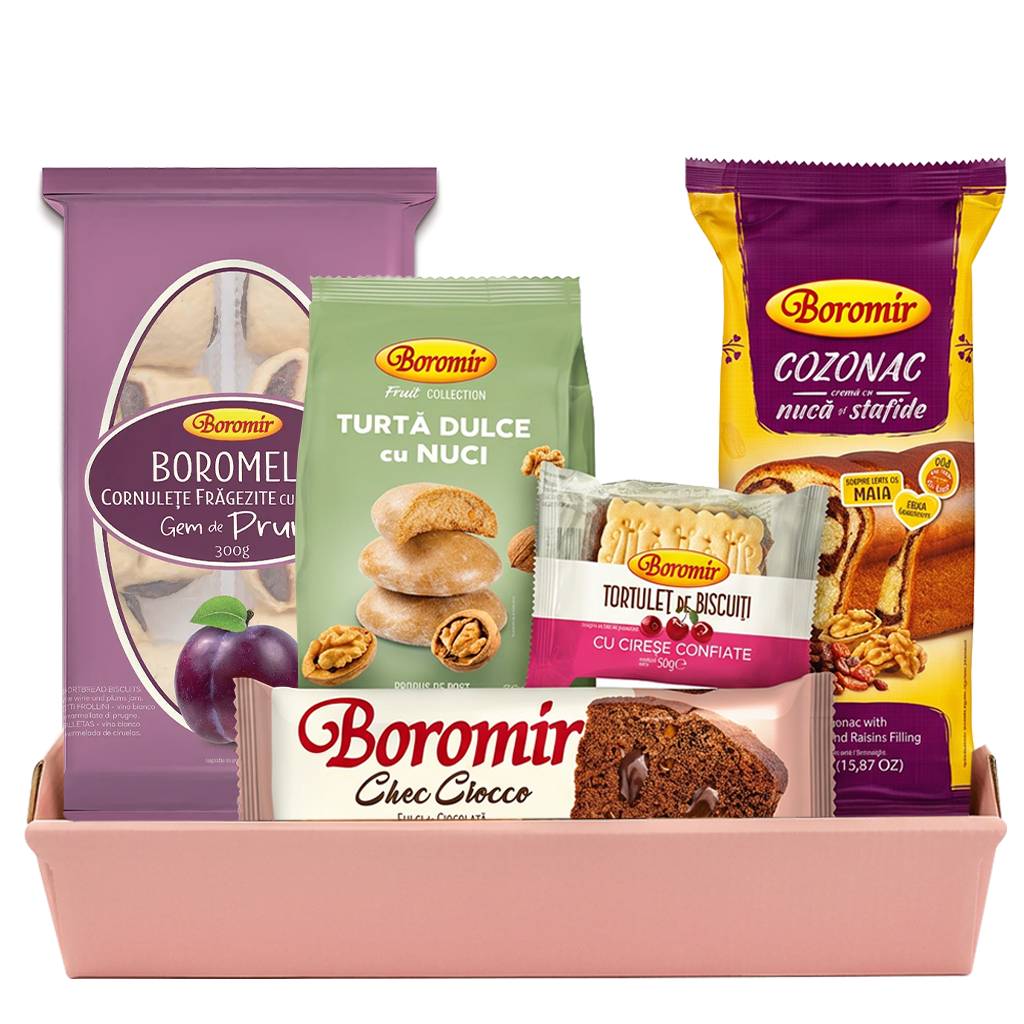 Cadoul Micile Plăceri este un dar deosebit care le oferă celor apropiați clipe prețioase de răsfăț și bucurie. Pachetul conține Cozonacul Boromir tradițional cu cremă de nucă și stafide, checul Ciocco cu cremă de ciocolată și rom, turta dulce cu nuci, Nuga cu miere si arahide, și cornulețele fragede Boromele cu vin alb și gem de prune. Sunt bunătățile perfecte cu care să le îndulcești ziua celor dragi indiferent de ocazie. Din Colecția Boromir de cadouri poți alege și alte pachete cu care să îți surprinzi familia și prietenii.