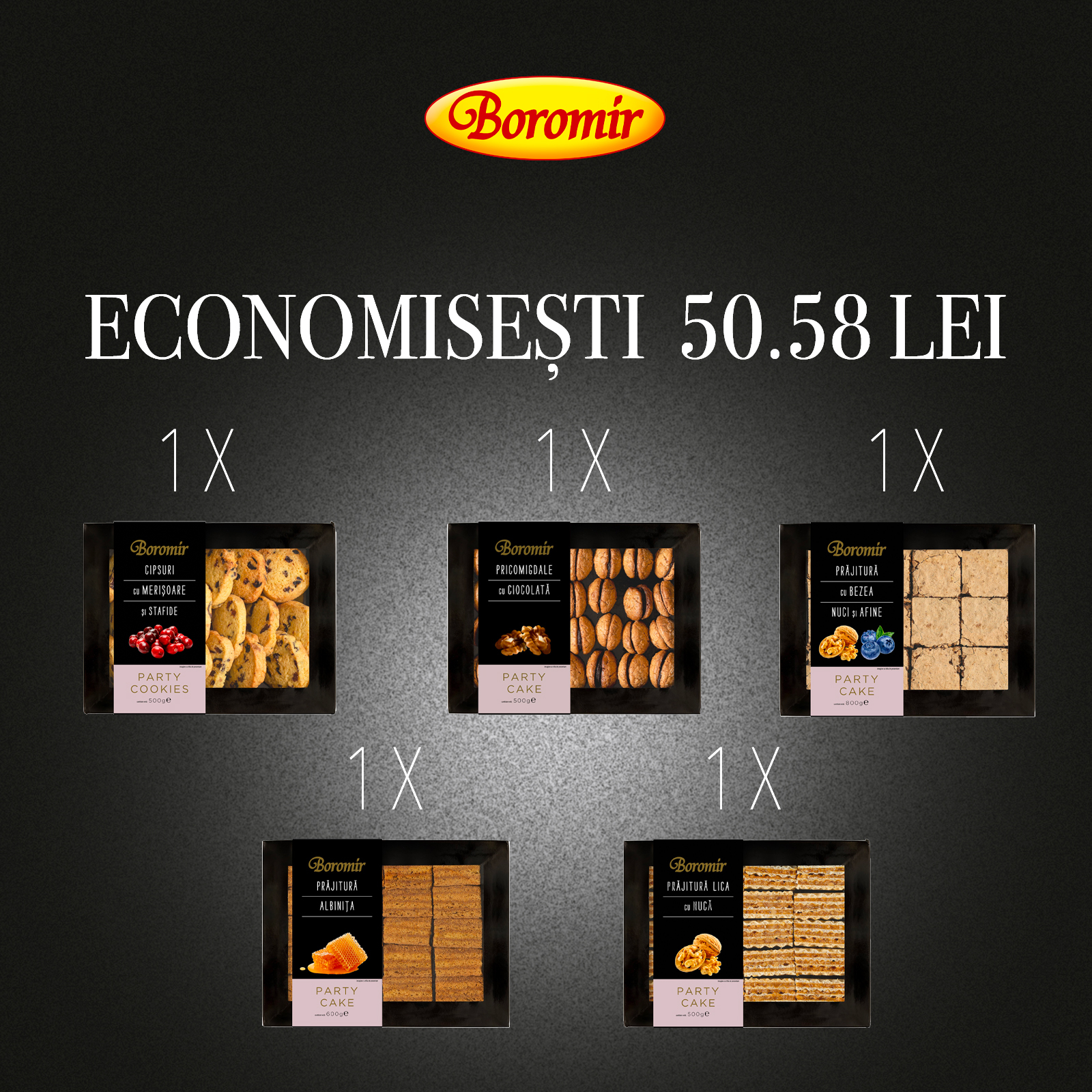 Pachet (1* CIPSURI CU MERISOARE SI STAFIDE 500G +1* PRICOMIGDALE CU CIOCOLATA 500G +1* PRAJITURA CU BEZEA, NUCA SI AFINE 800G +1* PRAJITURA ALBINITA 600G+ 1*PRAJITURA LICA CU NUCA 500G)