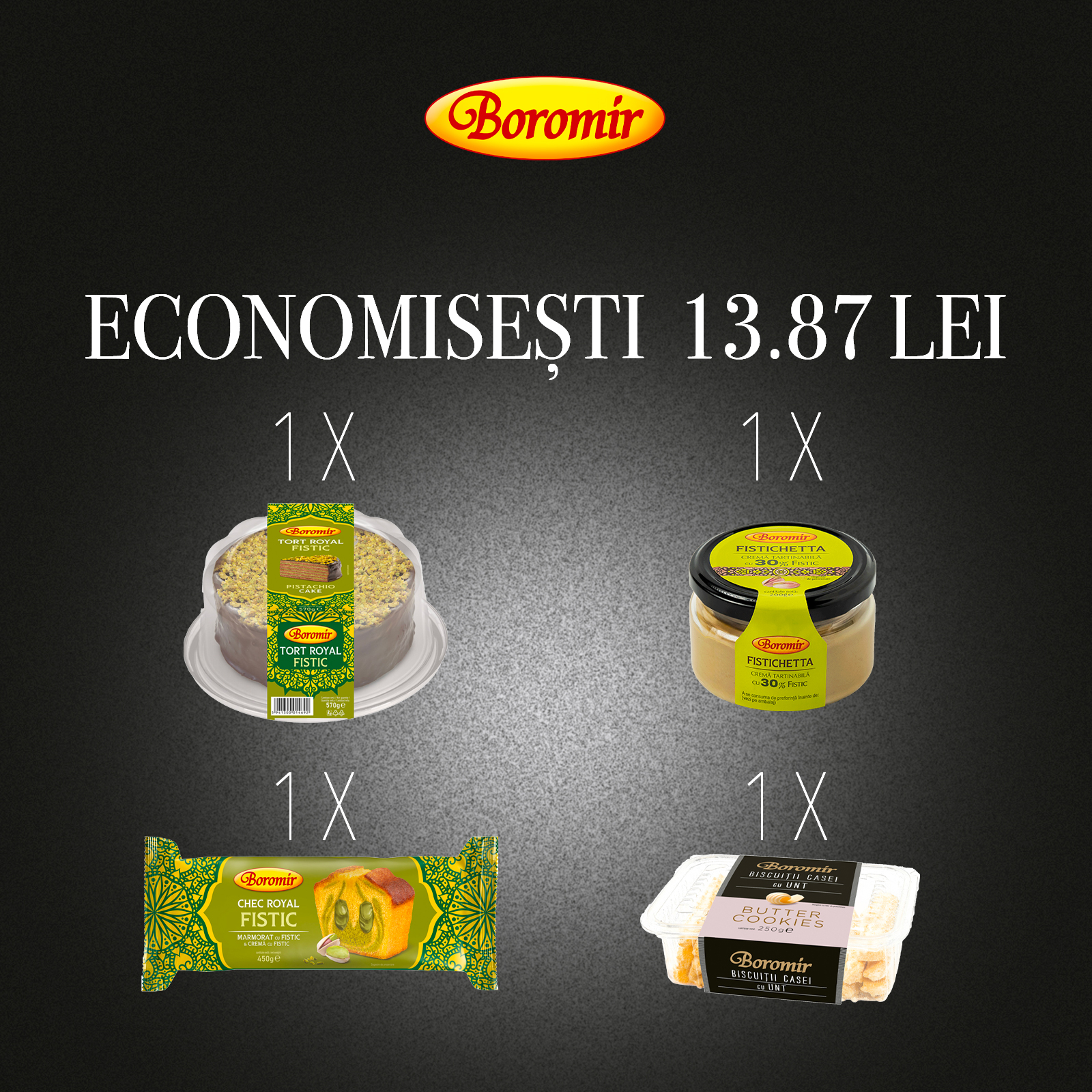 Pachet (1*TORT ROYAL FISTIC 570G+ CHEC ROYAL FISTIC 450G + CREMA TARTINABILA CU 30% FISTIC 200G + BISCUITII CASEI CU UNT 250G)