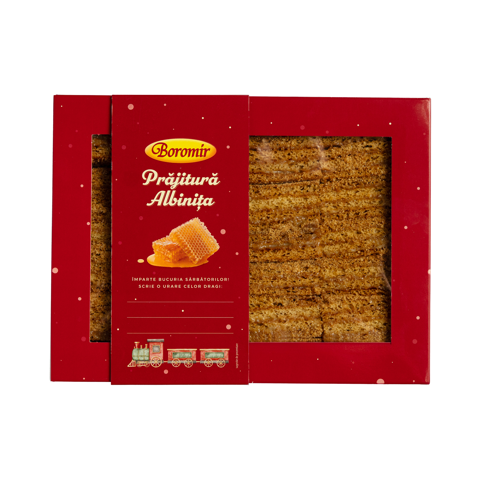 Prăjitura Albinița Boromir este un desert mult îndrăgit care se remarcă prin aroma delicată a umpluturii și a foilor preparate cu miere. Textura pufoasă este completată de gustul unic al mierii, conferind prăjiturii mai multă savoare. Prăjitura cu miere Albinița promite o experiență inedită de care să te bucuri cu familia și prietenii, potrivindu-se perfect pe platourile asortate de prăjiturele cu care vrei să îți surprinzi invitații. Un deliciu perfect pentru sărbători și petreceri, Prăjitura Albinița cu foi cu miere de la Boromir face parte dintr-o întreagă colecție de bunătăți pe placul tuturor. Descoperă alături de Boromir și alte gusturi inedite și împarte bucurii dulci celor dragi.